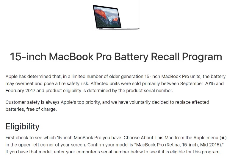 Because customer safety is a top priority, Apple is asking customers to stop using affected 15-inch MacBook Pro units. Customers should visit apple.com/sg/support/15-inch-macbook-pro-battery-recall for details on product eligibility and how to have a battery replaced, free of charge.